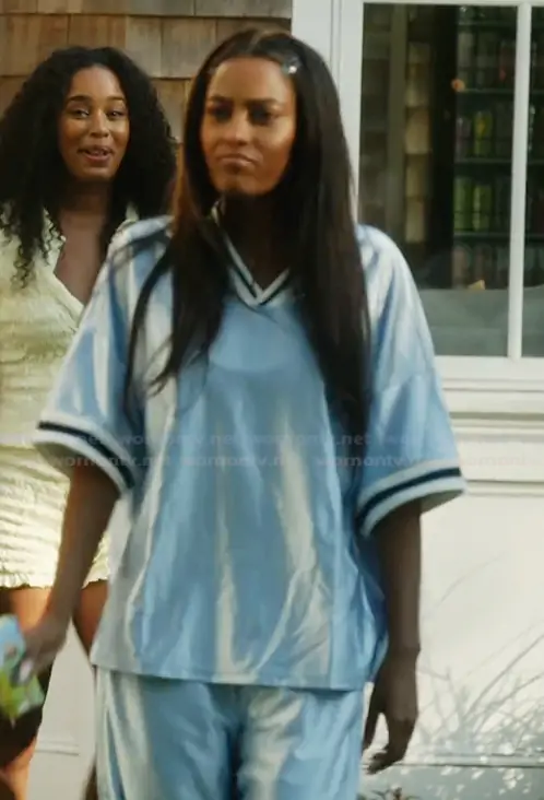 Ciara Miller on Summer House on Bravo was spotted wearing this blue varsity stripe top on Summer House on episode 'Boys of Summer' (10x12) in Apr 2026. Ciara's Top is the Varsity Satin V-Neck T-Shirt by Elwood . Ciara's Pants is the Reversible Tear Away Track Pants by Elwood.