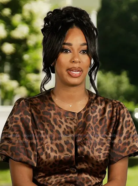 Mia Calabrese on Summer House on Bravo was spotted wearing this leopard print confessional top on Summer House on episode 'Boys of Summer' (10x12) in Apr 2026. Mia's Top is the Poppy Bubble Sleeve Blouse Top by Bubish.