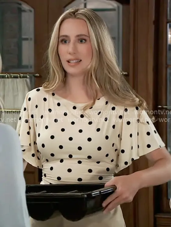 Josslyn Jacks (played by Eden McCoy) on General Hospital on ABC was spotted wearing this cream polka dot top on General Hospital on Apr 22 2026's episode. Josslyn's Top is the Avery Knit Top in Sundae Dot by Reformation .