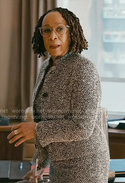 Sharon Goodwin (played by S. Epatha Merkerson) on Chicago Med on NBC was spotted wearing this herringbone tweed dress and jacket set on Chicago Med on episode 'Things Left Unsaid' (11x18) in Apr 2026. Sharon's Dress is the Giugno Dress by Max Mara . Sharon's Jacket is the Donald Jacket by Max Mara.