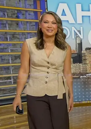Ginger Zee on Good Morning America on ABC was spotted wearing this beige tie waist vest on Good Morning America on Apr 22 2026's episode. Ginger's Vest is the Solid Tobie Linen-Blend Vest by Exquise.
