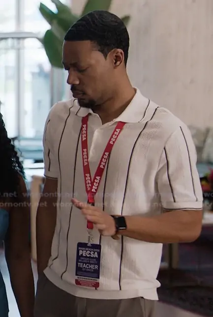 Gregory Eddie (played by Tyler James Williams) on Abbott Elementary on ABC was spotted wearing this white striped polo on Abbott Elementary on episode 'Miami' (5x22) in Apr 2026. Gregory's Shirt is the Regular-Fit Pointelle-Knit Polo Shirt by H&M.
