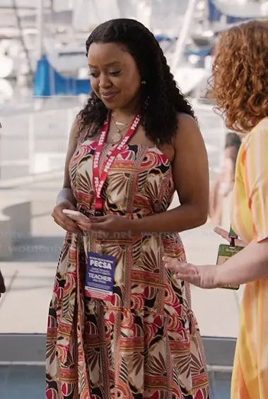 Janine Teagues (played by Quinta Brunson) on Abbott Elementary on ABC was spotted wearing this floral print midi dress on Abbott Elementary on episode 'Miami' (5x22) in Apr 2026. Janine's Dress is the Printed Tie Belt Maxi Sundress by Julia Jordan.