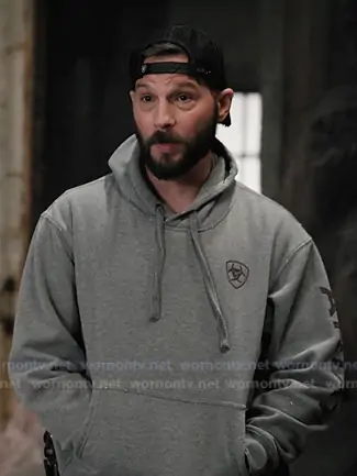 Pete Calvin (played by Logan Marshall-Green) on Marshals on Paramount was spotted wearing this grey print hoodie on Marshals on episode 'Blowback' (1x08) in Apr 2026. Cal's Sweater is the Logo Graphic Hooded Sweatshirt in Heather Grey by Ariat.