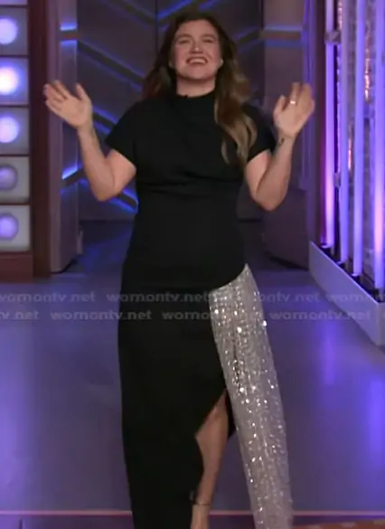 Kelly Clarkson on The Kelly Clarkson Show on NBC was spotted wearing this black mixed media draped dress on The Kelly Clarkson Show on Apr 24 2026's episode. Kelly's Dress is the Effie Draped High-Low Dress by Staud.
