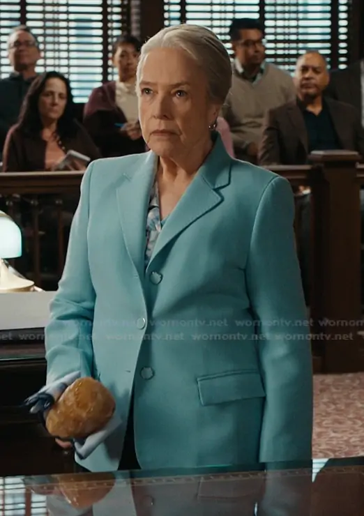 Madeline Matlock (played by Kathy Bates) on Matlock on CBS was spotted wearing this light blue three button blazer on Matlock on episode 'Matty Matlock' (2x16) in Apr 2026. Madeline's Blazer is the Single-Breasted Pick Stitch Blazer by Lafayette 148 New York.