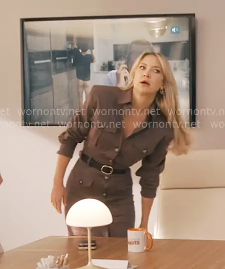 Isla Gordon (played by Kate Hudson) on Running Point on Netflix was spotted wearing this brown shirtdress on Running Point on episode 'MVP: Marcus Very Pissed' (2x04) in Apr 2026. Isla's Dress is the Buttoned-up Belted Dress by Self Portrait.