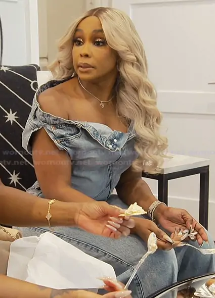 Phaedra Parks on The Real Housewives of Atlanta on Bravo was spotted wearing this denim off shoulder top on The Real Housewives of Atlanta on episode 'Where's the Beef... and the Budget?' (16x04) in Apr 2026. Phaedra's Top is the The Way I Want Off Shoulder Denim Top by Akira.