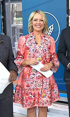 Dylan Dreyer on Today on NBC was spotted wearing this pink floral mini dress on Today on Apr 27 2026's episode. Dylan's Dress is the Floral Print V-Neck 3/4 Sleeve Belted A-Line Dress in Coral by Vince Camuto.