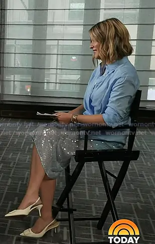 Jenna Bush Hager on Today on NBC was spotted wearing this blue shirt and sequin skirt on Today on Apr 28 2026's episode. Jenna's Top is the Perezzi Linen Button-Down Shirt in Blue Jay by Veronica Beard . Jenna's Skirt is the Allora Sequin Midi Skirt in Blue Jay by Veronica Beard . Jenna's Shoes is the Slingback Pointed Toe Pump in Ecru by Mango.