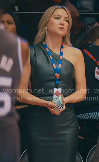 Isla Gordon (played by Kate Hudson) on Running Point on Netflix was spotted wearing this dark green leather one-shoulder dress on Running Point on episode 'Chicago-Style' (2x10) in Apr 2026. Isla's Dress is the Pelle Faux-Leather One-Shoulder Knee-Length Dress by Ronny Kobo.