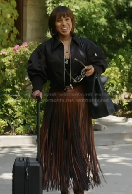 Eleanor (played by Kerry Washington) on Imperfect Women on Apple was spotted wearing this black puff sleeve jacket on Imperfect Women on episode 'The Bridge' (1x08) in Apr 2026. Eleanor's Jacket is the Satin Bomber Jacket by Vaquera . Eleanor's Skirt is the Veda Fringed Faux-Leather Midi-Skirt by Proenza Schouler . Eleanor's Sunglasses is the Miu Ombre square sunglasses by Miu Miu.