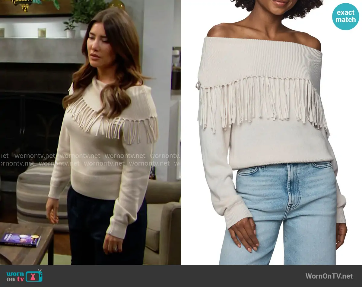 Maya Avant (played by Karla Mosley) on The Bold and the Beautiful on CBS was spotted wearing this off-white criss-cross front sweater on The Bold and the Beautiful on Nov 03 2016's episode. Maya's Sweater is the Tripping Sweater in Vanilla by Bailey 44.