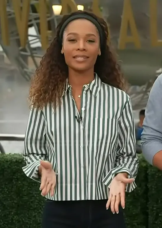 Halle Bailey's mixed stripe balloon sleeve dress on Access Hollywood