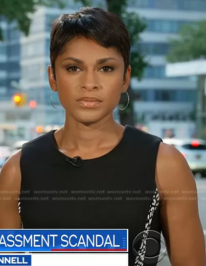 Jericka’s black spotted stripe sleeveless dress on CBS Evening News