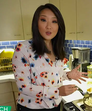 Nancy Chen's black floral v-neck top on CBS Mornings