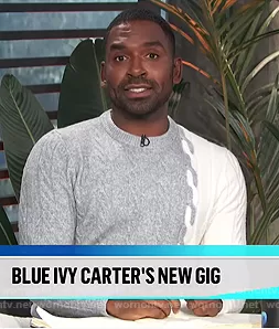 Justin's gray colorblock cable knit sweater on E! News Daily Pop