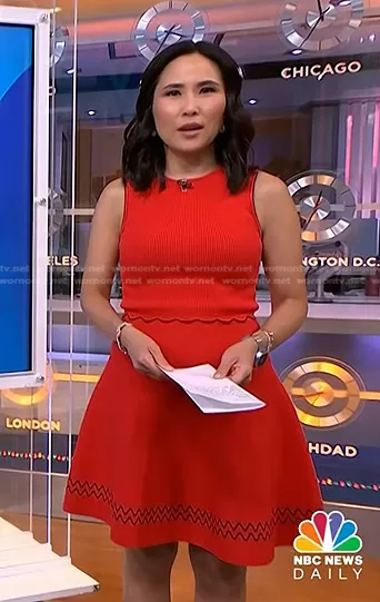Vicky's red ribbed scalloped dress on NBC News Daily