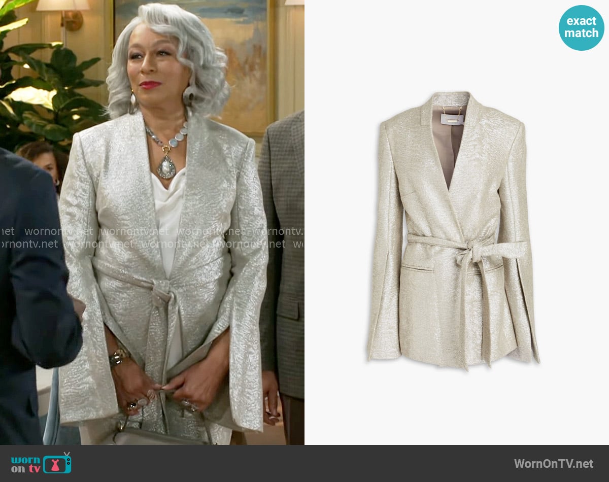 Anita’s metallic belted jacket on Beyond the Gates