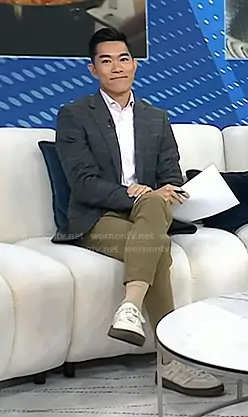 Chris's cropped v-neck cardigan and plaid pants on The Morning Show