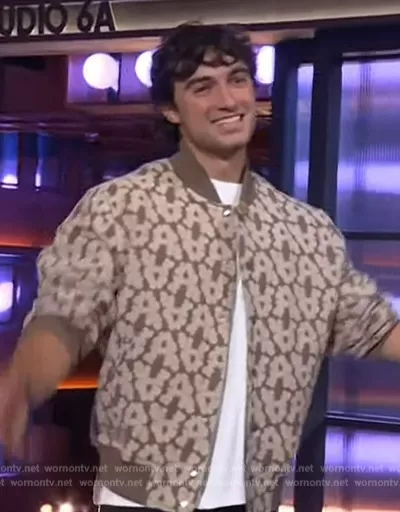 Ezra Frech's brown printed bomber jacket on The Kelly Clarkson Show