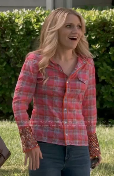 Gina's pink plaid shirt with embellished cuffs on B Positive