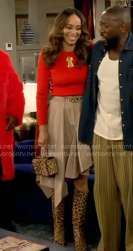 Mercedes' red key hole top and asymmetric skirt on The Neighborhood