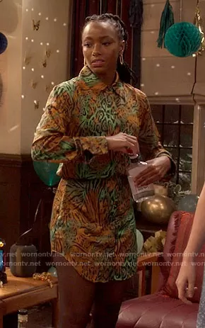 Whitney's green leopard print dress on The Sex Lives of College Girls