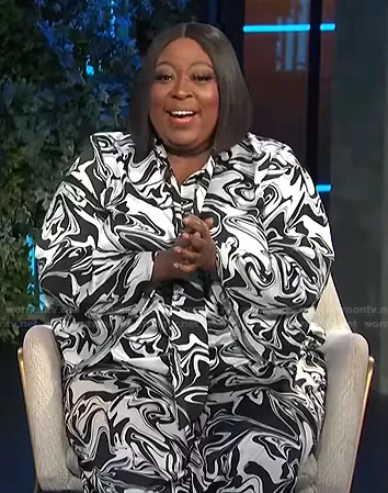 Loni's marble print tie neck top and pants on E! News Daily Pop