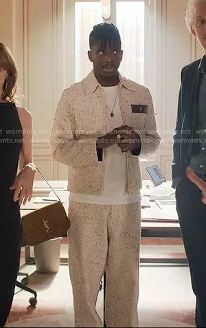 Julien's ivory tweed zip jacket and pants on Emily in Paris