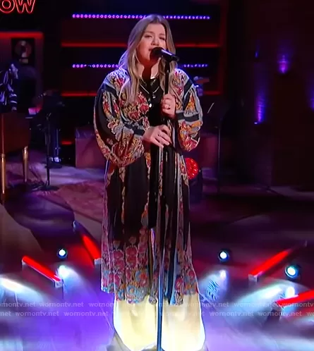 Kelly's black floral kimono top on The Kelly Clarkson Show