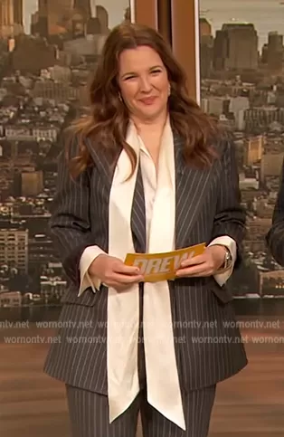 Drew's white pussy bow blouse and gray blazer on The Drew Barrymore Show