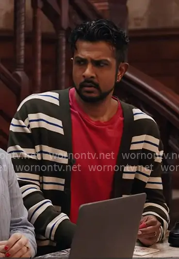 Jay's olive green striped cardigan on Ghosts