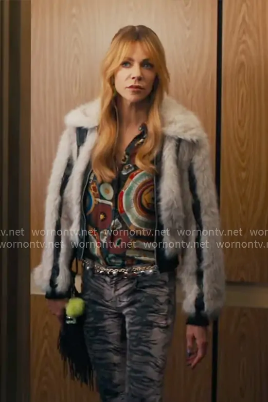 Morgan's printed shirt, zebra print jeans and fur jacket on High Potential