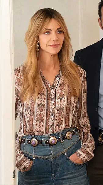 Morgan's printed shirt and denim mini skirt with gold heart earrings on High Potential