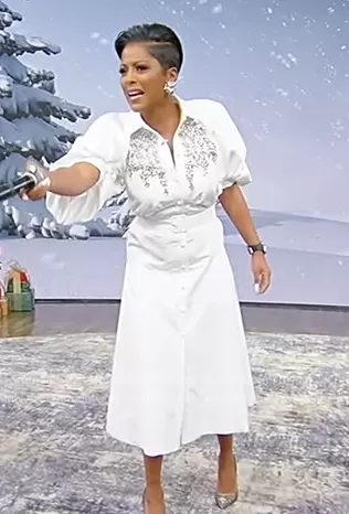 Tamron's white embellished belted dress on Tamron Hall Show