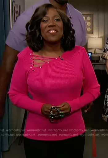 Sheryl's pink rib knit v-neck sweater on The Talk