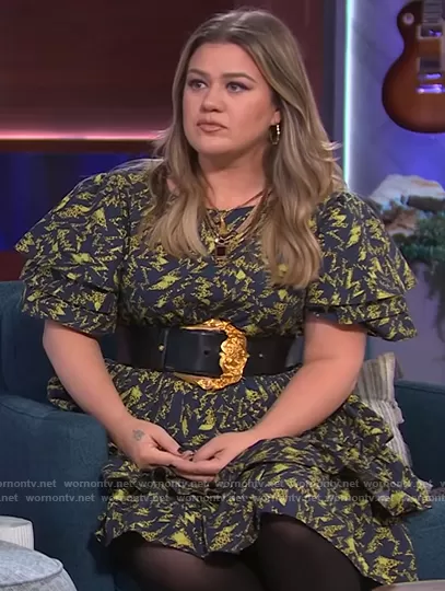 Kelly's black printed ruffle dress on The Kelly Clarkson Show