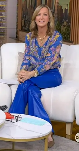 Lara's blue feather print blouse and leather pants on Good Morning America