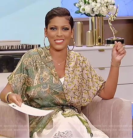 Tamron's printed wrap blouse and white lace skirt on Tamron Hall Show