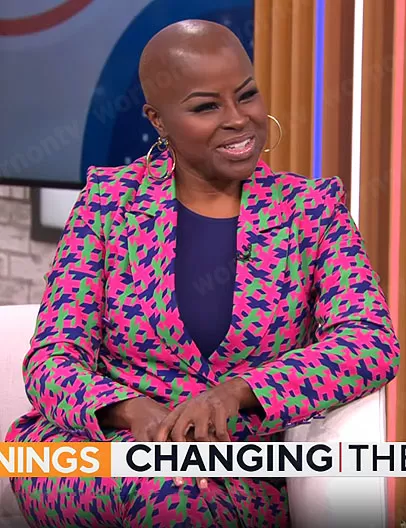 Kim Roxie's pink geometric print suit on CBS Mornings