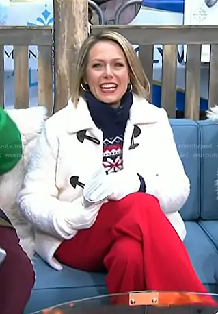 Dylan's navy print turtleneck sweater and white toggle jacket coat on Today
