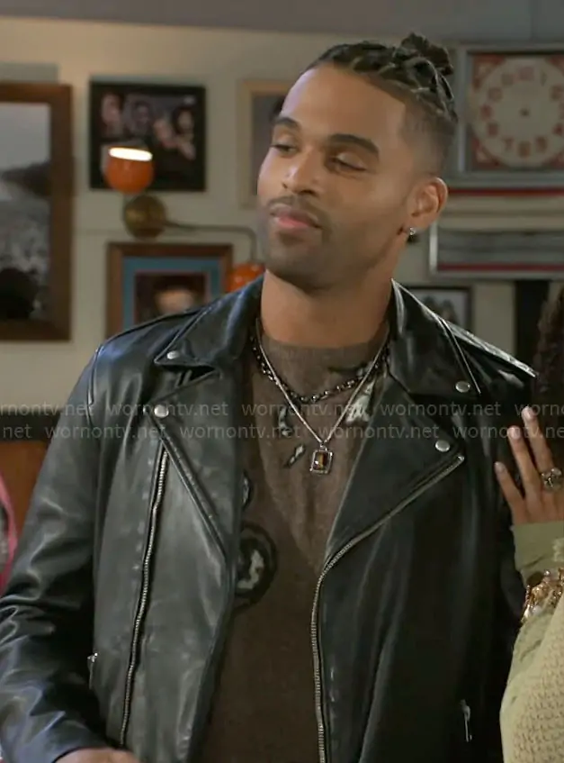 Izaiah's brown paisley sweater and leather jacket on Beyond the Gates