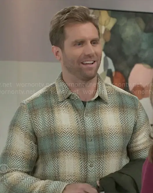 Derek's green herringbone and plaid shirt on Beyond the Gates