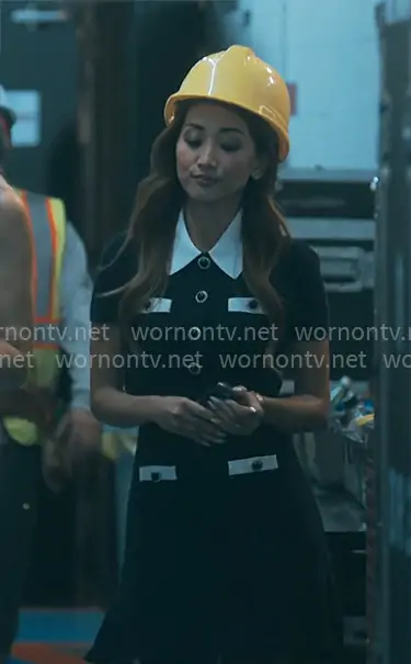 Ali's navy dress with white collar and buttons on Running Point