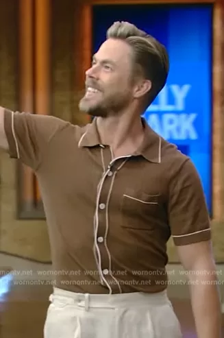 Derek Hough's brown contrast ribbed polo on Live with Kelly and Mark