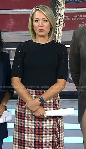 Dylan's navy button shoulder top and brown leather skirt on Today