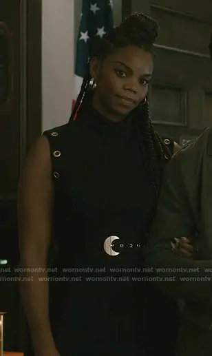 Julia’s black grommet belted dress on Elsbeth