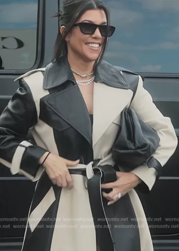 Kim's silver metallic swimsuit and coat on The Kardashians