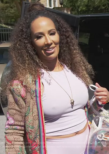 Tanya Sam's beige floral cardigan on The Real Housewives of Atlanta